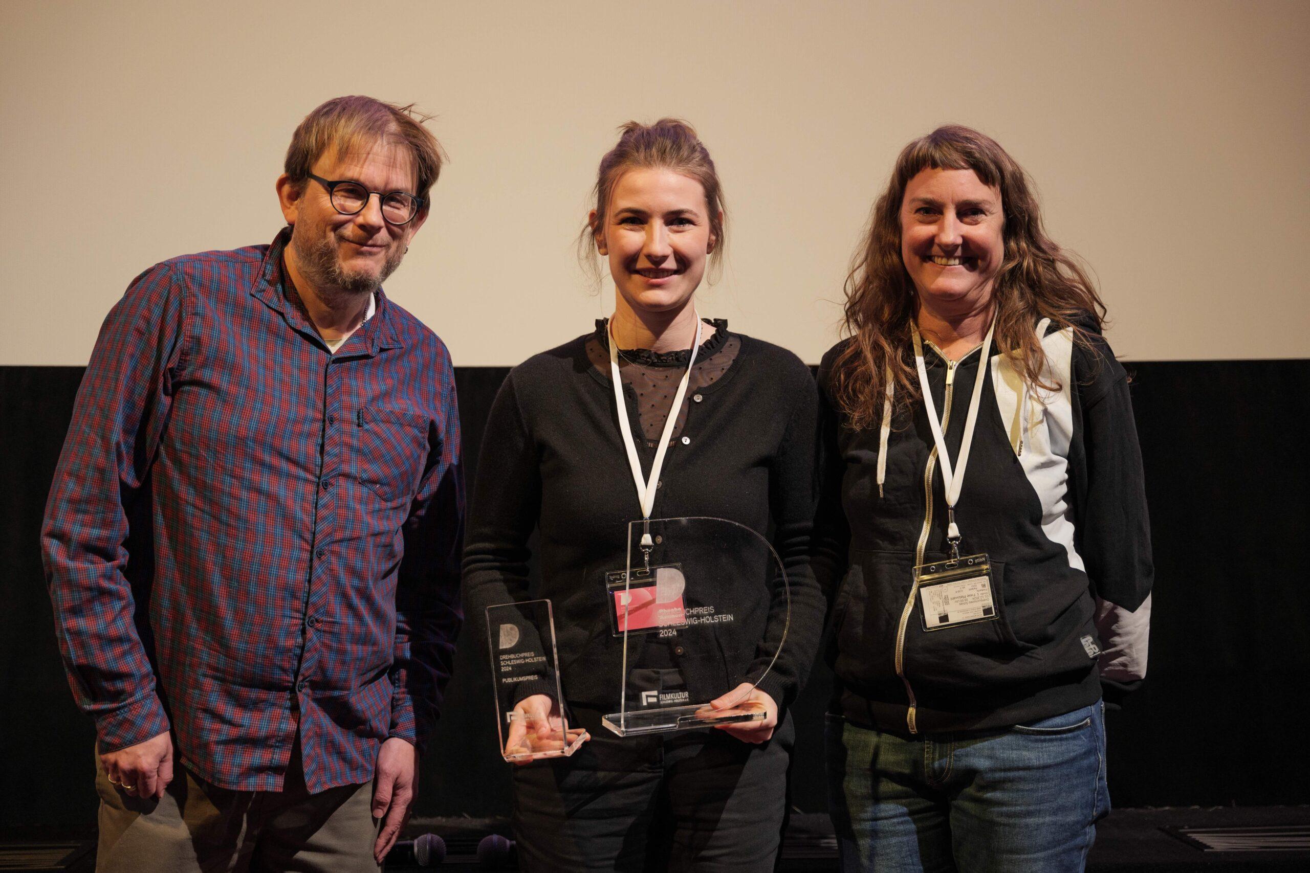 Phoebe Ammon erhält den Jurypreis 2024: Hier gerahmt von den Jurymitgliedern Jens Paulsen und Insa Wiese.